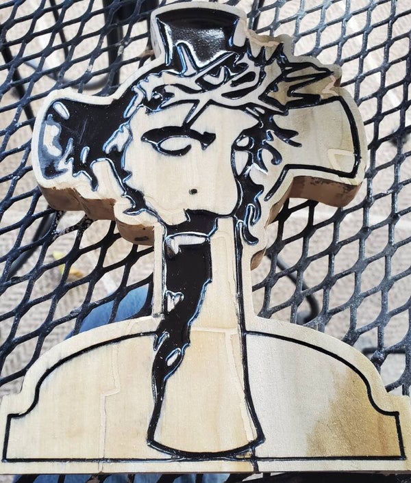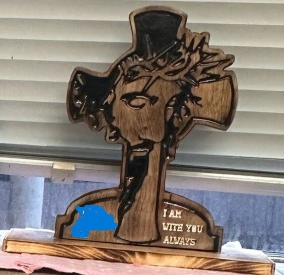 Carved Wooden Cross with the face of Jesus Christ carved and filled with black epoxy resin and personalized.